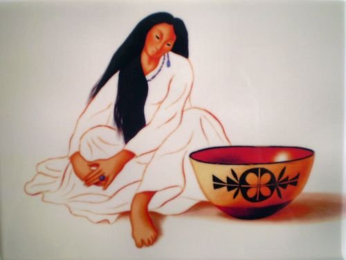 This Beautiful, Collectible Ceramic Art Tile features work by the world famous R.C. Gorman. He is known as the "Picasso of the Southwest". His work is known for its simplicity, and his colorful depiction of Navajo women, in particular. This one is titled "Potter's Choice". This tile measures 6 inches by 8 inches, and its finish is called a "crystal" finish due to the lustre of the shiny resin coating. There is a mount on the back for hanging, and also a photo stand, so that it may be displayed on a shelf. There is also a brief history of R.C. Gorman on the back of the tile. Once you see this beautiful work of art, you will surely want more than one!